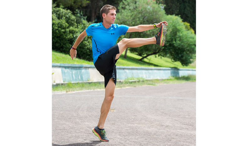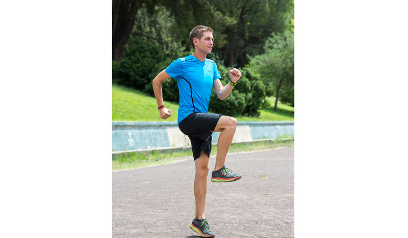 Camina hacia delante elevando la pierna que está en el aire hasta formar un ángulo de 90 grados con el abdomen. En esa posición la otra pierna debe llegar a extenderse completamente y a impulsar con el pie. En ese momento con la pierna elevada deberemos dar un pasito corto al frente encontrando el suelo e iniciando la siguiente zancada. Tienes que intentar que la trayectoria de ambos pies dibuje un círculo. Deberás acompañar todo el ejercicio con brazos de carrera.