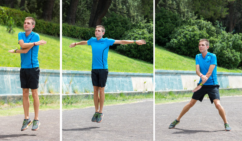 Corre lateralmente primero hacia un lado y luego hacia el otro. No cruces las piernas. No te preocupes si tus pies chocan en algún momento. Acompaña el movimiento abriendo y cerrando los brazos. Y los impulsos trata de hacerlos con fuerza de manera que cuando estés en el aire cojas altura.