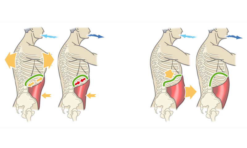 Cuando inspiramos metemos presión tanto al cajón abdominal como al torácico. Si a esto añadimos un pico máximo de tensión abdominal, conlleva alta presión sobre la zona que, de modo repetido, puede dañar el suelo pélvico, especialmente si es débil. Para evitarlo, en los momentos de máxima activación abdominal, hay que rebajar la presión interna espirando.