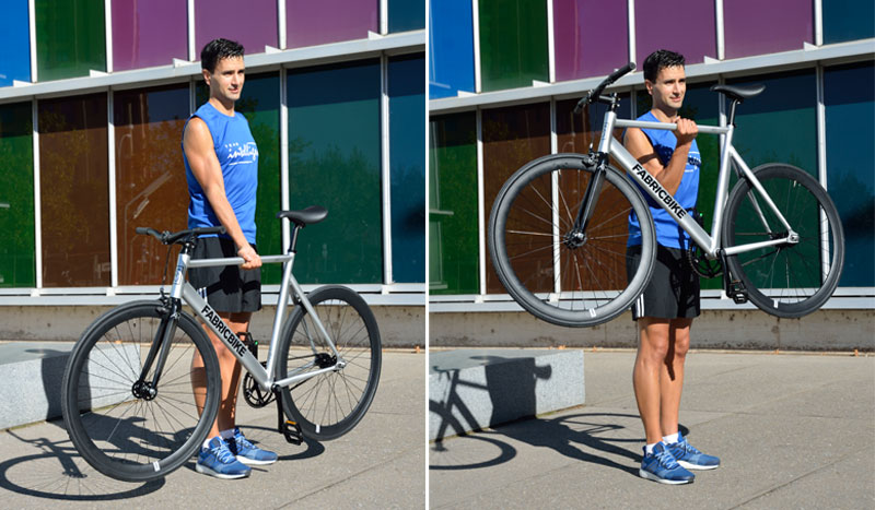 ✔ Coge la bicicleta por la punta del sillín y la potencia tratando de elevarla hasta la altura del los hombros, notando cómo los encoges.