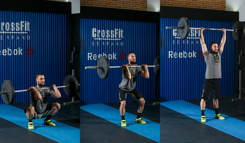 THRUSTERS: es la suma de dos ejercicios de trabajo con cargas: front-squat push-press, se debe realizar de manera fluida y sin interrupción. Puedes realizarlo con barra o mancuernas.