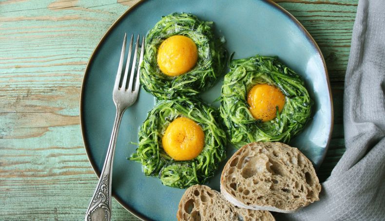 Forma el nido, haciendo un círculo con los zoodles o tiras de calabacín sobre papel de hornear, dejando un hueco en el centro.
