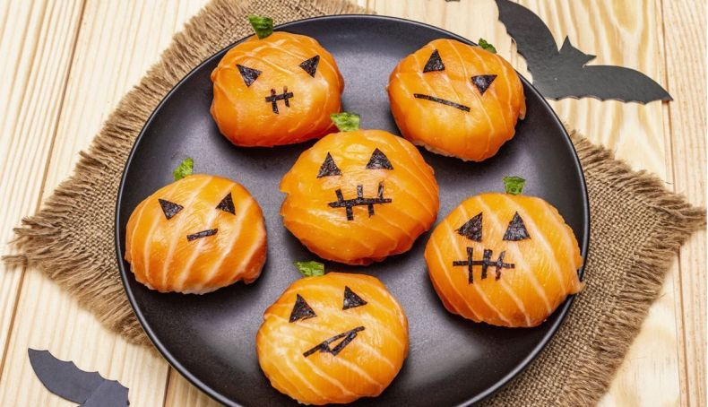 Tan facil como hacer arroz de sushi con vinagre de arroz, dar forma redonda y cubrir con láminas de salmón ahumado, decorando con láminas de algas nori las caras de las calabazas.
