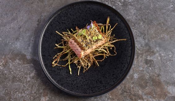 Cortamos el salmón por la mitad. 2. En la base del plato colocamos una cama de puerro frito. Encima, con la piel hacia arriba, acomodamos las dos mitades del lomo. Decoramos con brotes o pétalos azules o morados (nunca la flor entera, únicamente los pétalos).