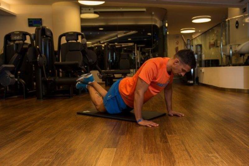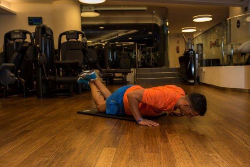 Como ves, el apoyo de rodillas resta intensidad y hace más fácil que te familiarices con el gesto. Si al principio ni siquiera te sale este ejercicio debes esperar a seguir con la progresión hasta que seas capaz de ejecutar 10 flexiones de forma continua y a continuación realizar 10 sentadillas, de igual modo.