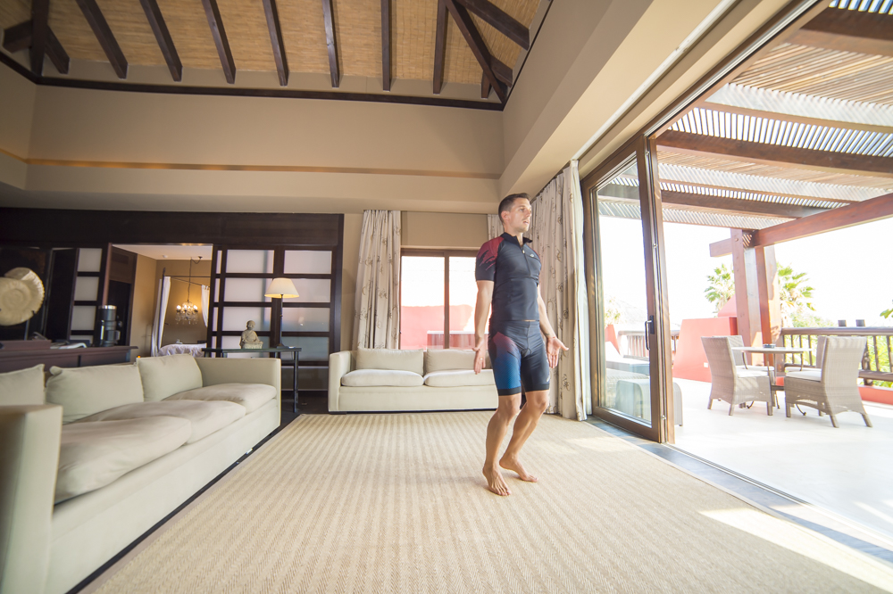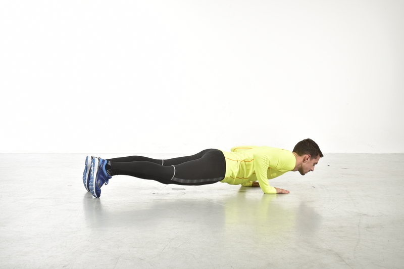 Aquí son varios los aspectos a tener en cuenta. En primer lugar, la cadera permanece neutra, manteniendo una plancha que conserva la curvatura natural de nuestra espalda. En segundo lugar las manos se colocan a una altura un poco superior a la del ancho de nuestros hombros. Los dedos de las manos están abiertos y la palma debe intentar que el suelo rote sobre el eje de la muñeca, hacia el exterior. Además, con la presión de las manos debes intentar “romper” el suelo que está debajo, intentando separarlo. Recuerda que la cintura escapular se mantiene activada.