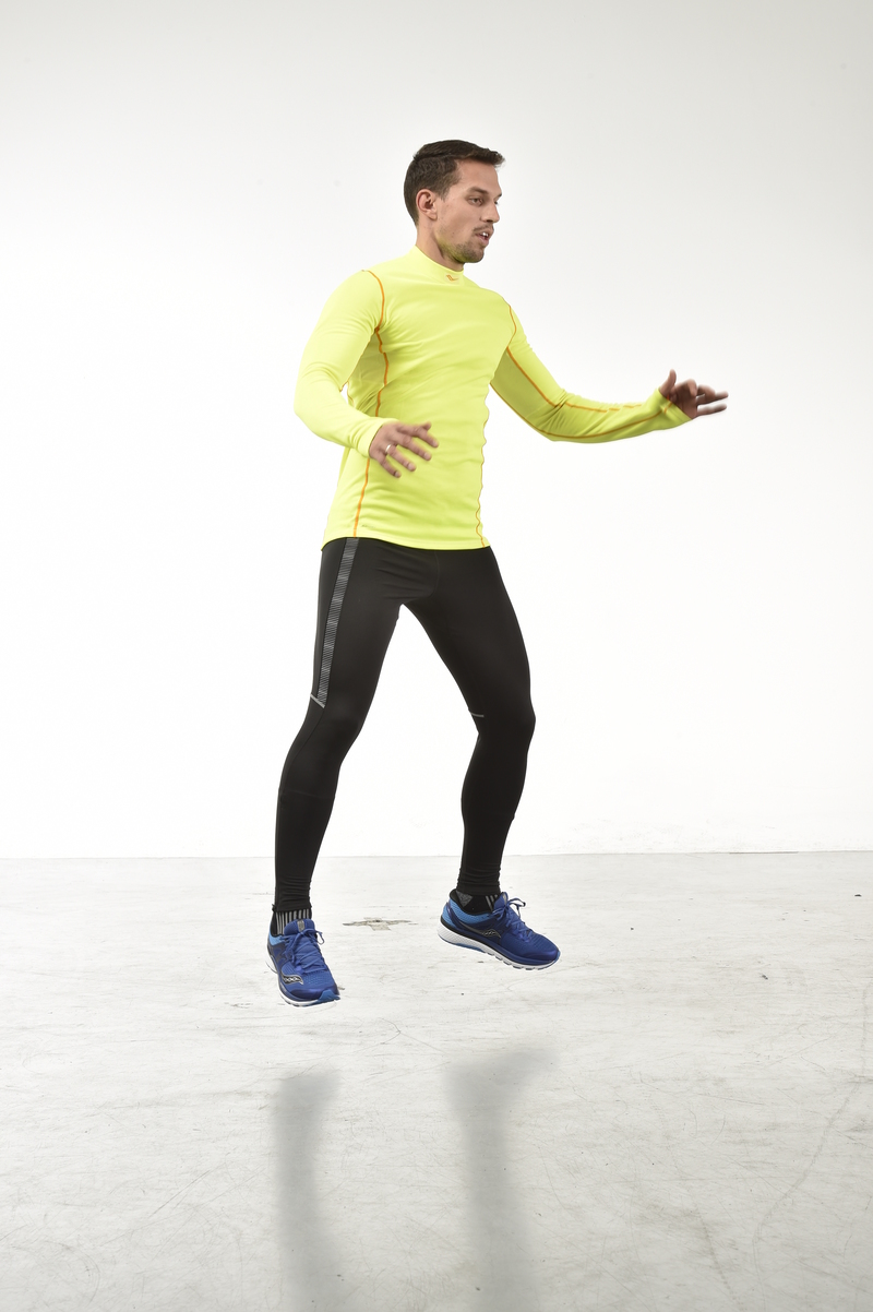 Aquí introducimos el primer ejercicio de fuerza con carácter anaeróbico. Apoya las manos en una superficie elevada y cruza las rodillas hacia el lado contrario para simular una especie de carrera cruzada. Completa otras 30 repeticiones con cada pierna y pasa al siguiente ejercicio. Observa que la espalda no se curva y el cuerpo dibuja una plancha diagonal perfecta.