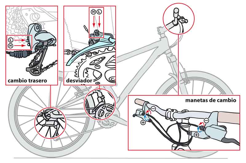 1º Si la cadena se te sale, bien por el lado del plato grande o por el del pequeño, lo primero es ajustar los tornillos del desviador delantero. Si se va por el plato grande hacia fuera, atornilla (sentido horario) el tornillo "High" o "H" hasta que no se salga. Si se va por el plato pequeño hacia el cuadro presiona el tornillo "L".
