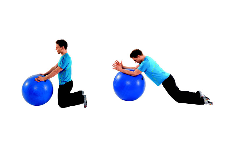 1} Comenzar de rodillas. Las puntas de los pies apoyadas sobre el suelo. Las manos tocando el balón de estabilidad que está colocado delante.