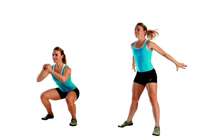 2} Bajar rápidamente la pelvis hasta que los muslos queden paralelos al suelo, y luego saltar de una forma explosiva. Estirar los brazos hacia atrás y absorber el impacto del salto con una ligera flexión de las rodillas.