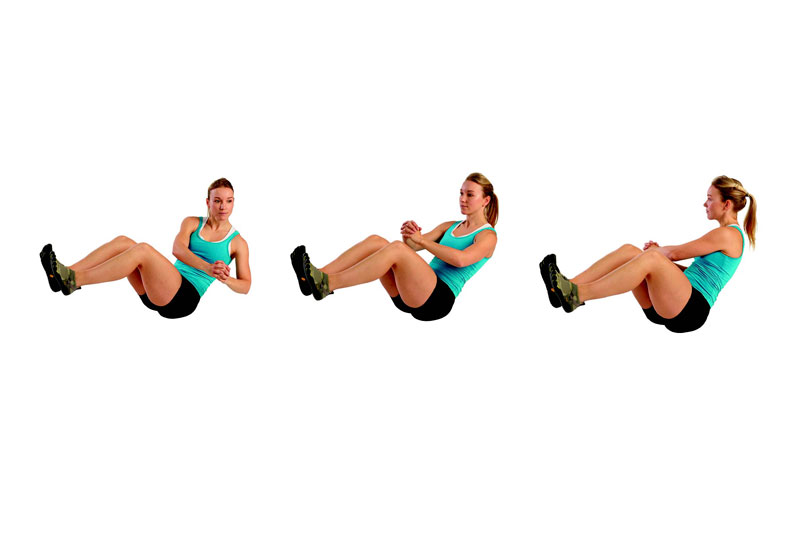 1} Comenzar sentado en el suelo. Levantar los pies de forma que las piernas formen un ángulo de 45º con los muslos.