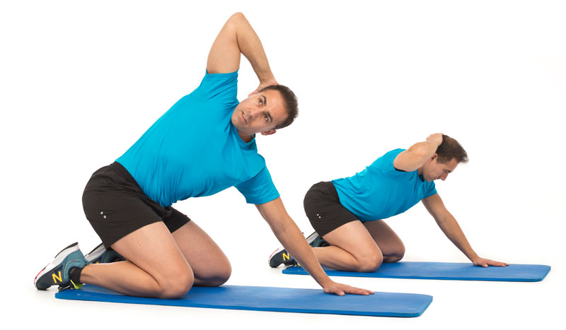 - Arrodillado, proyecta las manos lo más lejos posible manteniendo la columna extendida y estable.