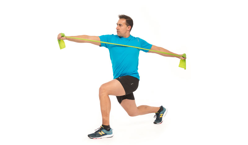 O con una zancada atrás, pero el tensor debe tocar siempre el pecho.