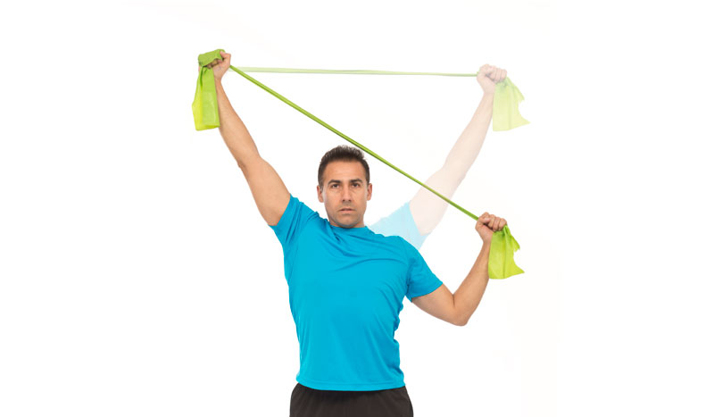 - Separa el tensor y desciende un brazo con el codo apuntando al suelo hasta que el tensor contacte con la cabeza.