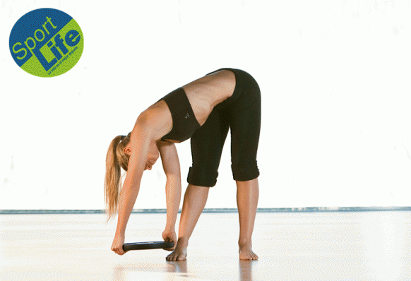 Peso muerto girado: Con un disco sujeto en tus manos, realiza giros a ambos lados de tus piernas dejando caer el peso del cuerpo. Beneficio: Estiramiento activo de la cadena muscular tónica que se presenta acortada. |