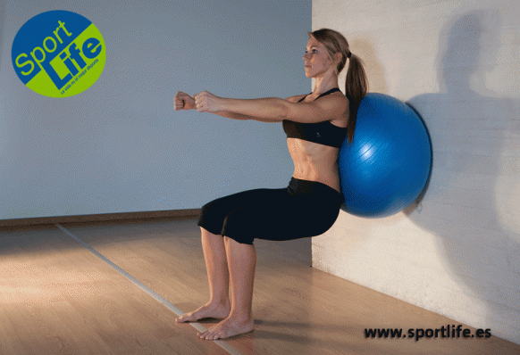 Sentadilla con balón en la pared: Sitúate a 90º con un balón detrás de tu columna y extiende una pierna manteniendo la posición. Beneficio: Mejor control postural y estimulas a los receptores sensoriales de la columna. |