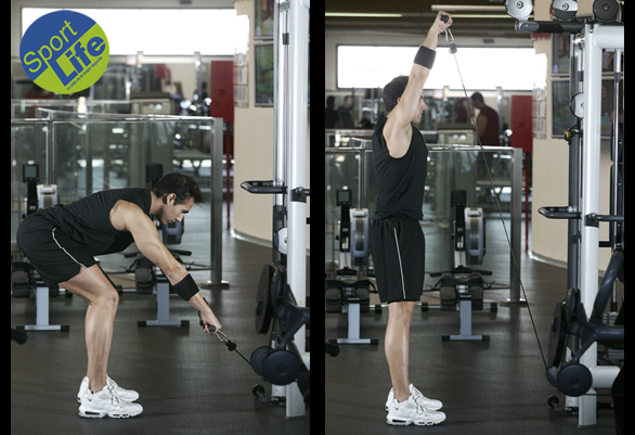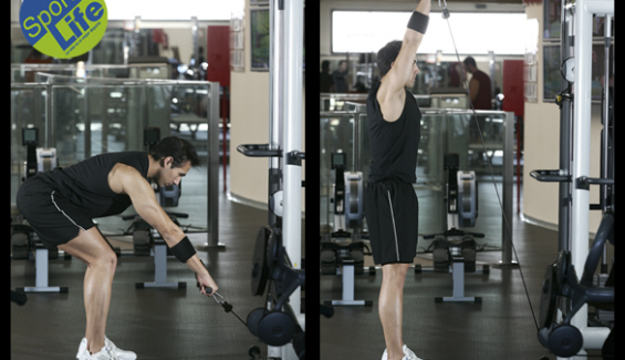 Sepárate un poco de la polea baja y desde la máxima flexión, realiza una extensión pero siempre con los brazos extendidos. Eleva hasta la vertical para cargas ligeras a moderadas en trabajos de tonificación o fuerza-resistencia, si la carga es elevada no es necesario elevar los brazos, tan solo realiza un movimiento de peso muerto.
