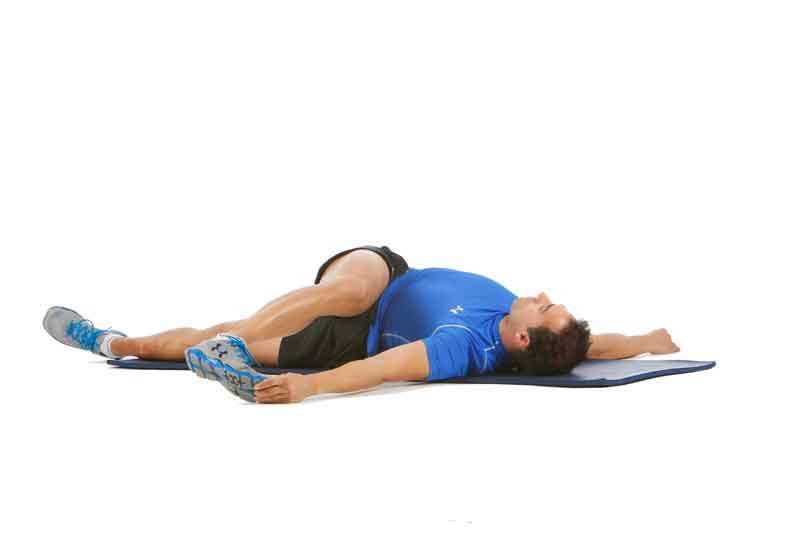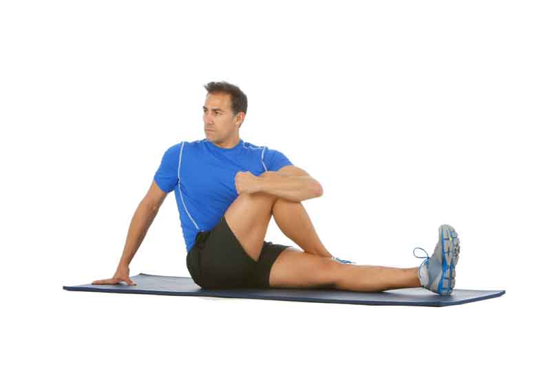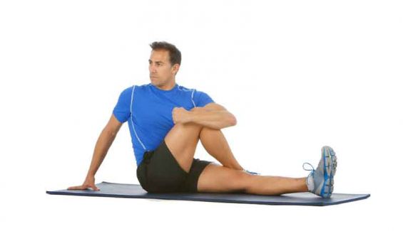 • En el suelo, lleva una pierna cruzada sobre la otra y acerca la rodilla a tu pecho con el brazo.