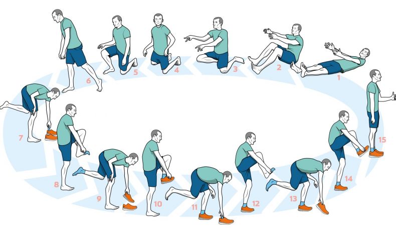 1. Túmbate en el suelo y levántate sin tocarlo con las manos en ningún momento. Si no lo consigues, inténtalo solo con un apoyo. Cada apoyo extra que tengas que hacer juega en tu contra.