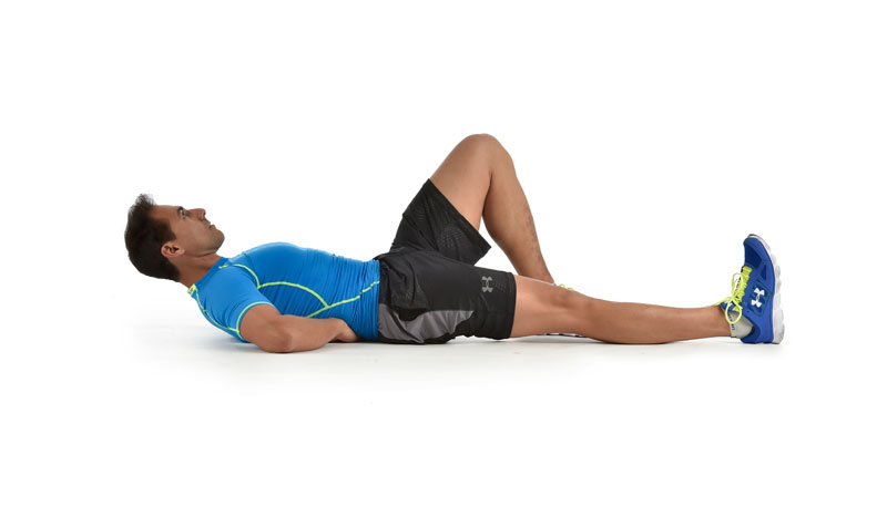 Una opción es realizar un curl con la región lumbar estable y manteniendo su curva natural. Eleva tan solo los hombros y deja la zona lumbar en apoyo. Para favorecer una posición neutra de la cadera, coloca una pierna flexionada y otra extendida.