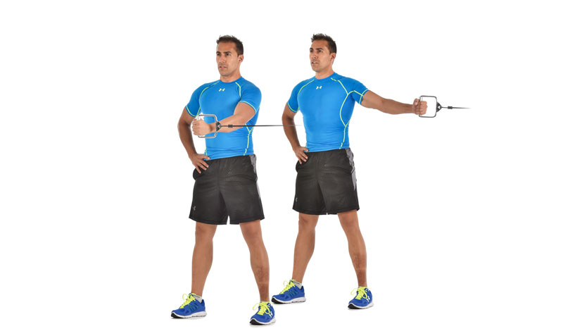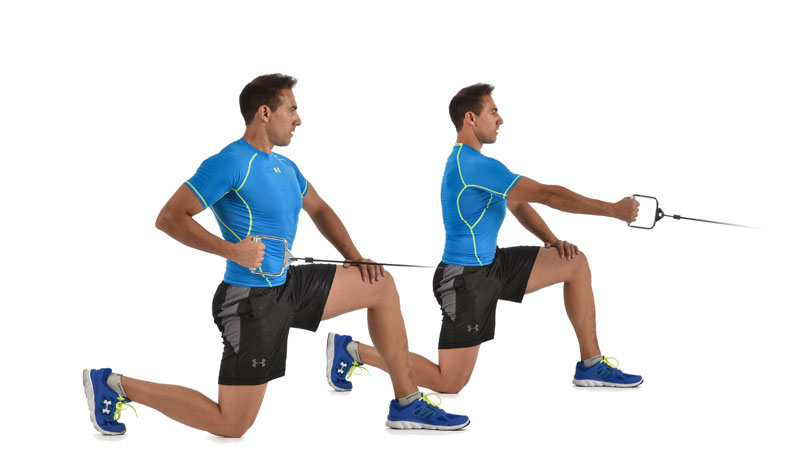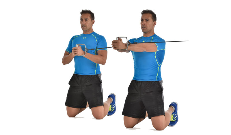 Otra alternativa es el press Pallof, donde el objetivo es evitar la rotación que genera la polea o tensor. Los oblicuos actúan de forma intensa al aumentar la palanca con la extensión de los brazos.