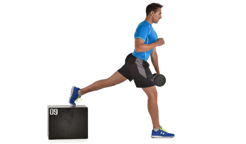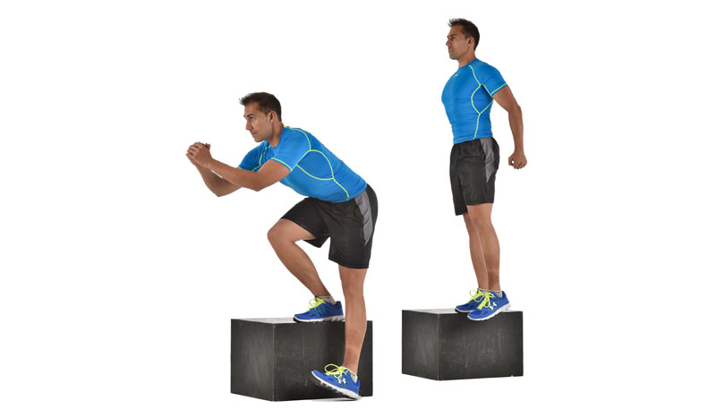 Consigue una altura acorde al nivel de intensidad que necesites. Desde el apoyo unipodal, desciende de forma lenta y controlada hasta que el talón toque el suelo suavemente para volver a ascender.