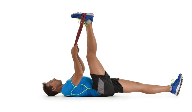 Una opción mucho más cómoda y segura, ya que la columna permanece estable, es la que consiste en realizar el ejercicio tumbado y ayudándose con un tensor para aumentar la flexión de cadera.