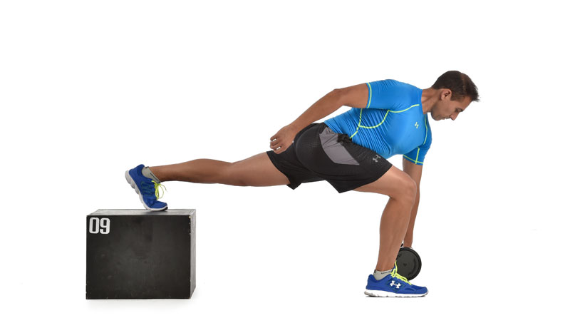 Una opción para seguir haciendo peso muerto facilitando la cadera en posición neutra es manteniendo una pierna atrás. Al conseguir cierta tensión en los flexores de cadera, la cadera queda en una situación de equilibrio en su margen neutro. Para manejar cargas moderadas, este ejercicio unipodal te resultará más eficiente. Estas variaciones también tienen la ventaja de que aportan mayor transferencia a gestos deportivos como los apoyos unipodales o trabajos con cadenas cruzadas.