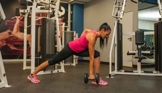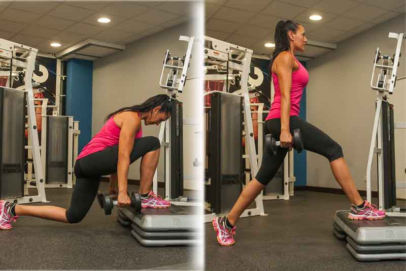 3º Sitúa un pie sobre un step y desciende hasta que la rodilla de la pierna de atrás casi toque la superficie al tiempo que desciendes la carga flexionando la cadera, conseguirás la máxima flexión de cadera.