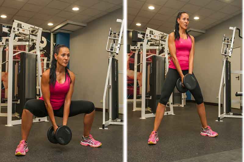 1º En el peso muerto tipo sumo, separa bien las piernas y sobre todo intenta acercar la carga hacia el suelo. En el punto más bajo, las rodillas deben quedar justo sobre el apoyo de pies.