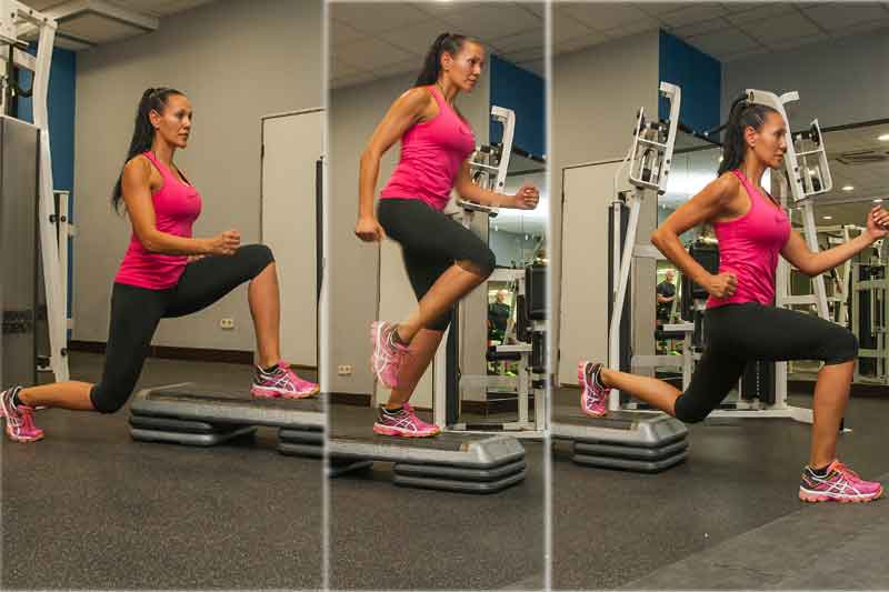 4º Incluye algún ejercicio dinámico con potencia. Realiza una zancada adelante y atrás de forma continua, pero no olvides realizarla de forma muy amplia.