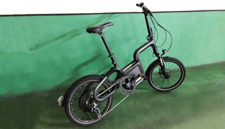Aunque no es plegable, la Kymco Q sí que se compacta mucho al poder doblar el manillar hacia abajo, bajar el sillín y plegar los pedales, que se quedan verticales y de esta forma puedes guardarla más fácilmente en sitios pequeños.