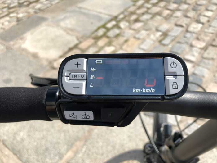 La pantalla es extraíble e integra los controles para mayor o menor asistencia (botones y -), cambio de la información de la pantalla (botón INFO), empuje adicional Turbo (botón con símbolo de la bici), a su derecha el botón que conecta las luces, arriba a la derecha el interruptor de encendido y apagado y debajo, con el símbolo de un candado, el botón que activa la alarma.