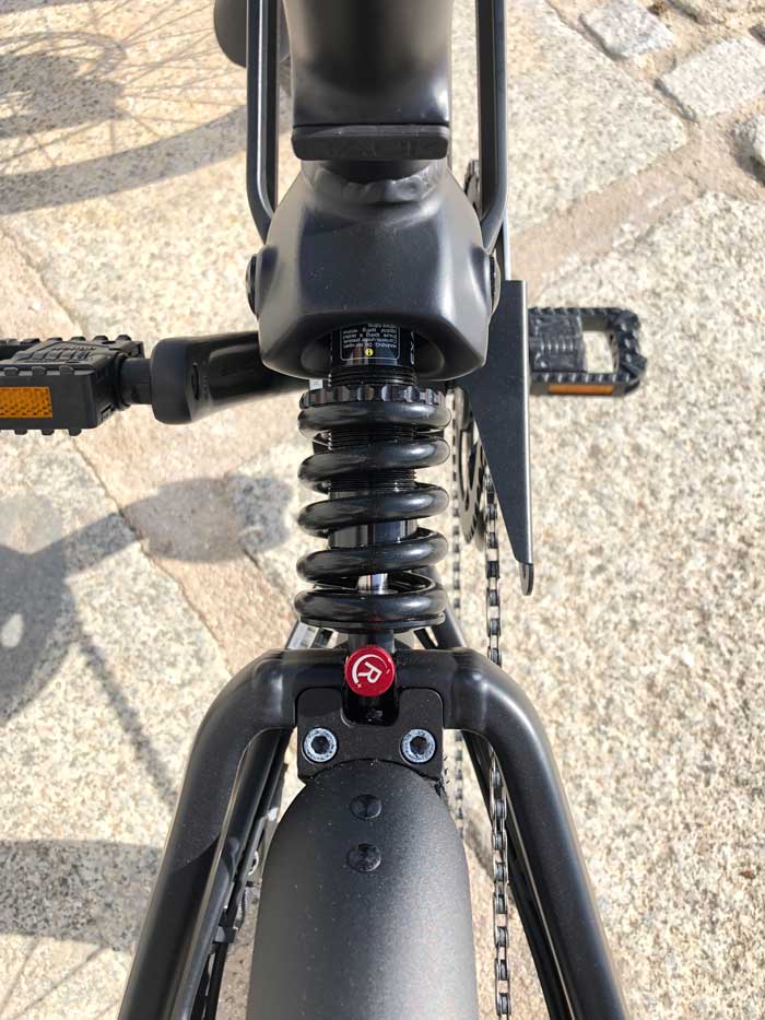 Las suspensiones son hidráulicas, la trasera tiene un muelle regulable en precarga y control de rebote por medio de ese dial rojo que se aprecia en la imagen.