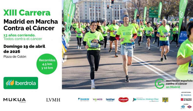 La Asociación Española Contra el Cáncer en Madrid abre hoy las inscripciones para participar en la XIII edición de la Carrera Madrid en Marcha Contra el Cáncer, que se celebrará el domingo 19 de abril de 2026 por las calles del centro de la capital.