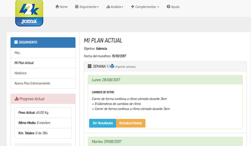 La aplicación está disponible para web y móviles y hay tres versiones diferentes, una gratuita, una versión pro de pago para objetivo un maratón y una versión plus también de pago en la que se pueden introducir varios maratones como objetivo.