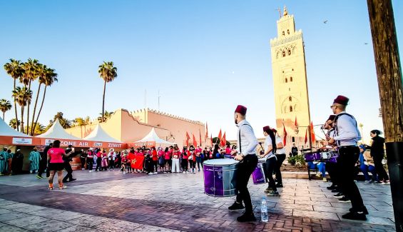 La salida de “La Kechoise” no puede ser más espectacular. El arco de salida está justo debajo del alminar de la Koutoubia (de 66 metros de altura). Allí, con 500 participantes, arrancó la carrera que tiene 7 km, que son prácticamente llanos, y que tiene su primera parte por grandes avenidas hasta llegar a la parte final que es una de las carreras más especiales que he hecho yo en mi vida. Corres por el interior de la Medina hasta llegar a la Plaza des Ferblantiers, justo al lado del Palacio el Badi y el barrio judío. Para que nada falte tanto en la salida como en meta hay un grupo de música tradicional marroquí.