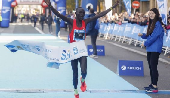 San Sebastián, 26 nov (EFE).- Los atletas kenianos fueron protagonistas absolutos de la edición número 45 de la Maratón de San Sebastián, en una prueba más lenta en hombres con la victoria del favorito Benson Tunyo y meritoria por desarrollarla totalmente en solitario de su compatriota Emma Cheruto, que logró la victoria en mujeres. La climatología se alió con los corredores, con tiempo fresco pero sin viento y con un sol que era un aliado para templar la fría temperatura de primera hora de la mañana, lo incrementaba la ilusión de que pudiera caer algunos de los récord de esta maratón.