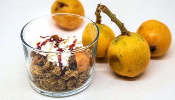 Esta receta de crumble crujiente de nísperos con yogur griego es un postre fitness que puedes tomar antes o después de entrenar.