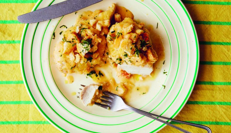 Esta sencilla receta es una de mis favoritas de toda la vida: pollo en una cremosa salsa con vino blanco, cubierto con queso suizo y picatostes. Llevo tiempo queriendo incluirla en algún libro como homenaje a mi abuela y a mi madre que la preparaban cuando era niño, y me volvía loco.